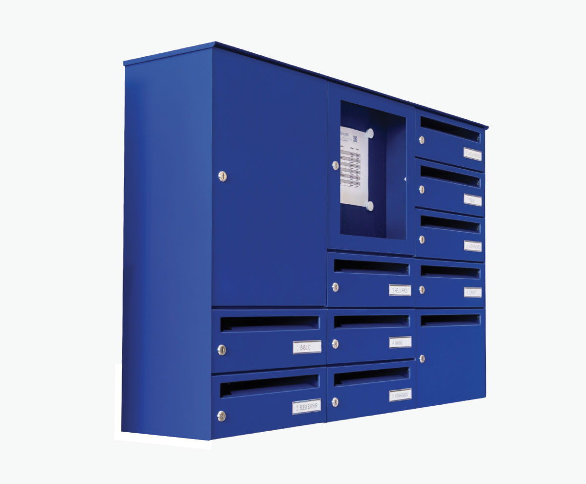 Porte individuelle : Porte tôle d’acier anti vandale électrozinguée 15/10ème peinte avec barre de renfort solidaire du coffre/Articulation Par axe acier diamètre 5mm/Serrure de sûreté à 2 clés plates fixée par clips, came renforcée 40/10ème/Porte nom par voyant inaccessible de l’extérieur.